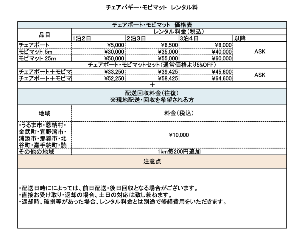 ※チェアボート、バギーの配送・回収に関しては一度ご相談ください。